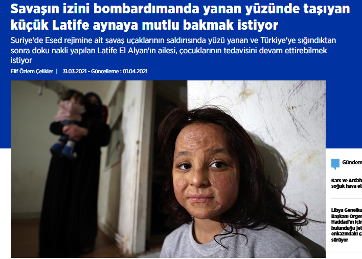 | Suriye'de Esed rejiminin düzenlediği hava saldırısında yaralanan ve 10 yıldır süren savaşın acı izlerini bombardımanda yanan yüzünde taşıyan 6 yaşındaki Latife El Alyan, tedavi olmak istiyor. Suriye'de 2011'den itibaren süren iç savaş nedeniyle yaşadıkları evlerini terk etmek zorunda kalan, yakınlarını düzenlenen saldırılarda yitiren binlerce insan gibi büyük üzüntü yaşayan minik Latife, yüzünün tekrar güleceği günlerin hayalini kuruyor. İdlib'de 2019'daki bombardımanda yaralanarak ailesiyle Türkiye'ye sığınan Latife, Şanlıurfa'da doku nakliyle geçirdiği yüz ameliyatının ardından yarım kalan tedavisinin devam etmesi için destek bekliyor. Yakınlarının ve hayırseverlerin yardımlarıyla yaşadıkları Bursa'da ameliyatın ardından kullanması gereken kremleri alamayan, gerekli kontrollerini yaptıramayan minik kızın annesi, yaşadıkları dramın son bulması için dua ediyor. Eşyasız bir evde 3 çocuğu ve eşiyle yaşam mücadelesi veren 31 yaşındaki Hala Alabdullah, AA muhabirine, İdlib'deki saldırı sonrasında büyük korku yaşadıklarını, kızının bombardımanda ölümden dönmesine karşın ağır yaralandığını söyledi. Kızının tedavisi için Türkiye'ye geldiklerini anlatan Alabdullah, "Eşim, kızımın yüzünü gördükten sonra bağırdı çağırdı, psikolojisi bozuldu. Komşular hemen ambulans çağırdı. Sonrasında 2019'da Şanlıurfa'ya geldik. Kızım burada ameliyat oldu. " dedi. |